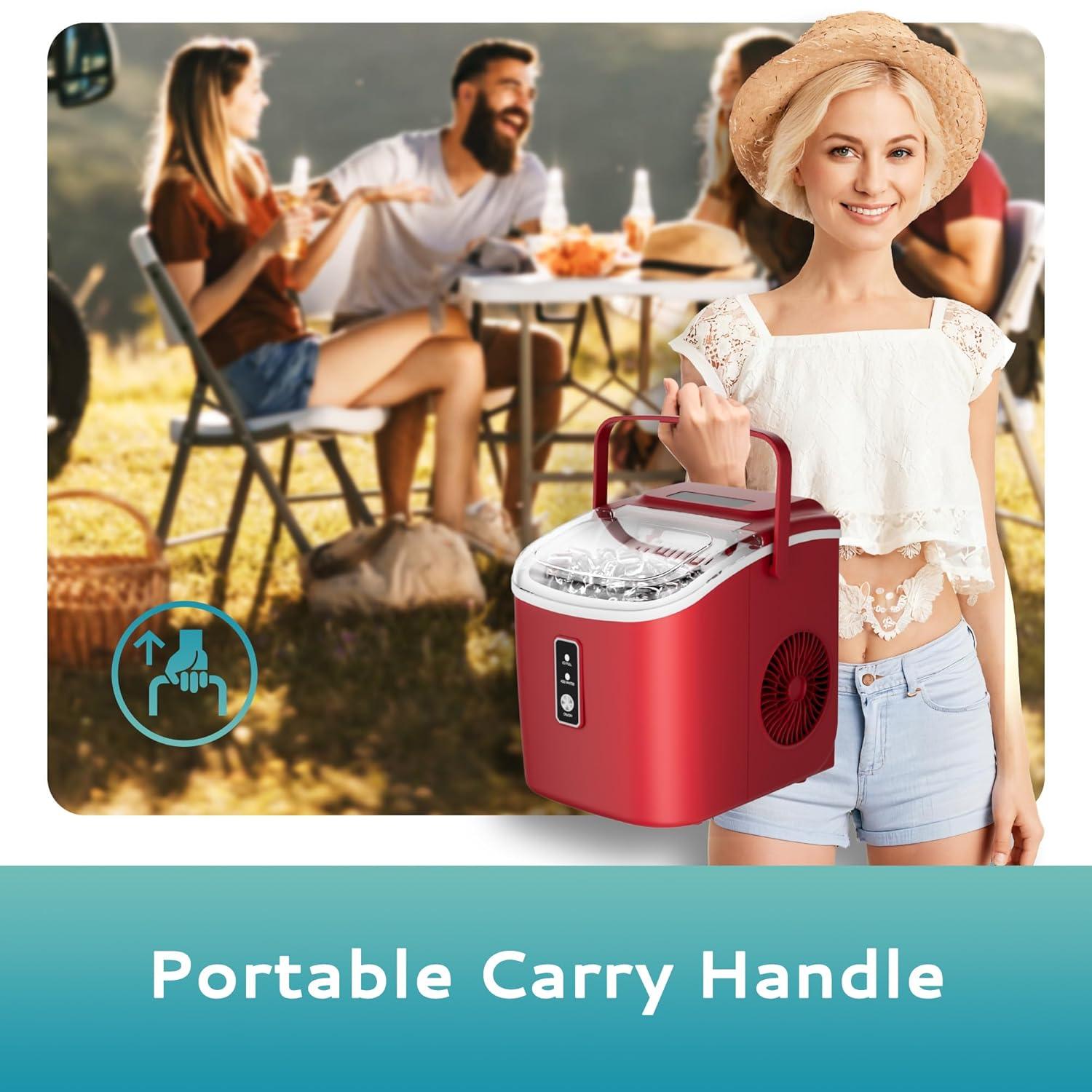 EUHOMY Countertop Ice Maker Machine with Handle, 26lbs in 24Hrs, 9 Ice Cubes Ready in 6 Mins, Auto-Cleaning Portable Ice Maker with Basket and Scoop, for Home/Kitchen/Camping/RV. (Pink)(Red)