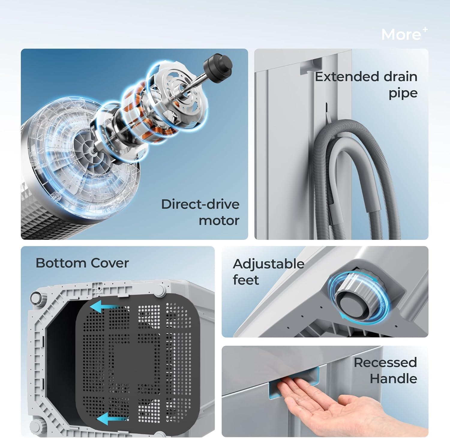 Portable and High Performance: The Euhomy portable washer machine weighs 54.01 pounds and measures 34.57×20.87×20.47 inches. The 1.59 cubic foot compact washer can wash more clothes at a time, up to 11lbs/5kg. The stainless steel drum provides a stable structure and has a built-in removable filter disc for filtering lint and pet hair.