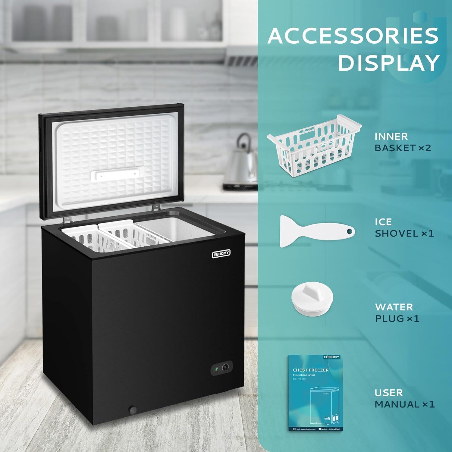 AFTER-SALES SERVICE – Euhomy small chest freezer has a professional and efficient service team that is ready to answer your questions. Product list: Chest freezer 3.5 cu ft *1 Removable inner basket *2 Ice shovel *1 Water plug *1 User's manual *1 Tips: Please let the meat freezer stand upright for at least 24 hours before use