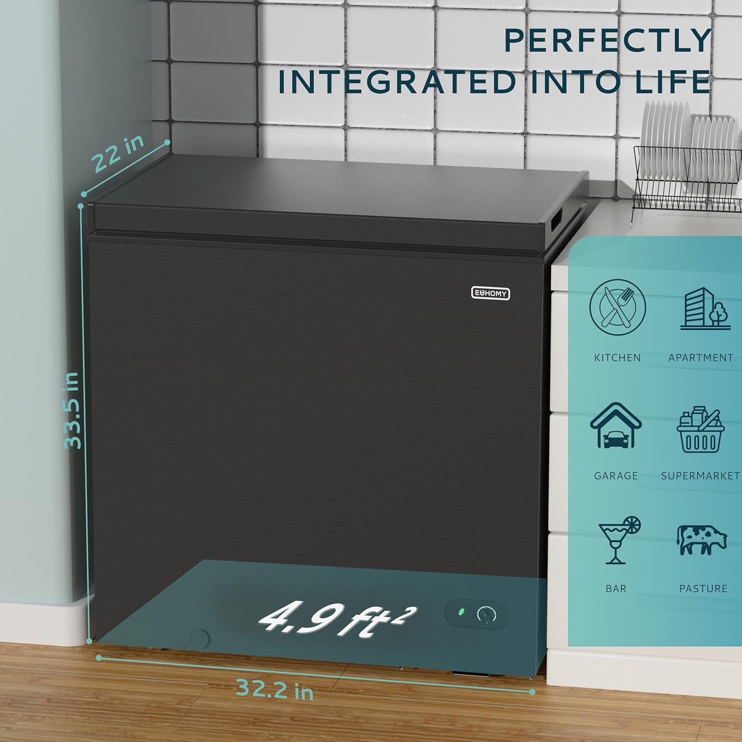 COMBINE CAPACITY AND SIZE – Euhomy freezer requires only a small footprint of 3.2 ft² and fits into the corner of most kitchens, apartments, dining rooms, garages. The compact size: 21.2″(W) x 21.6″(D) x 31″(H) allows the deep freezer to fit cabinets, and the large internal capacity of 3.5 cuft can hold about 33lbs of beef and 48lbs of fish, enough to meet daily needs