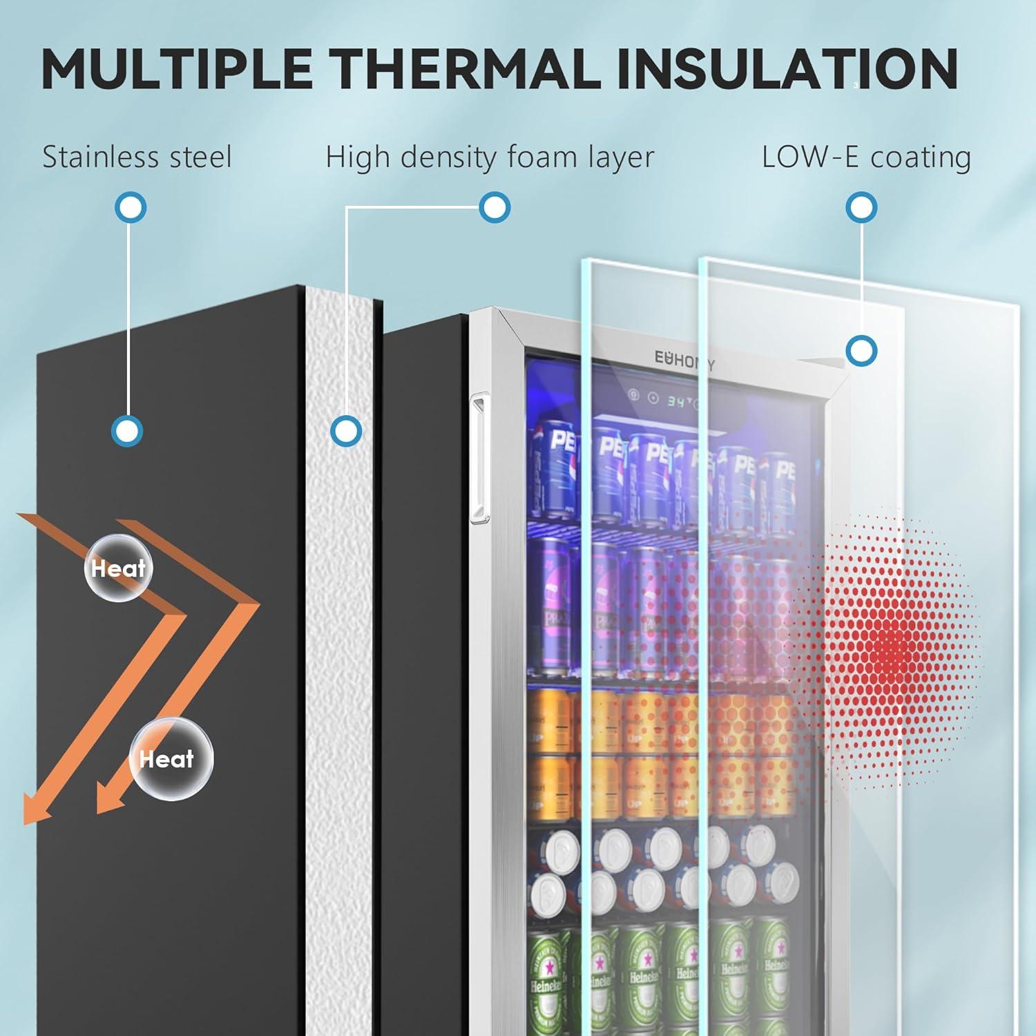EUHOMY 48 Can Beverage Refrigerator cooler-Mini Fridge Glass Door for Beer Drinks Wines, Countertop Beverage Fridge with Adjustable Shelves Blue LED for Home/Office/Dorm/Bar, 1.3 cu.ft(3.2 CUFT)