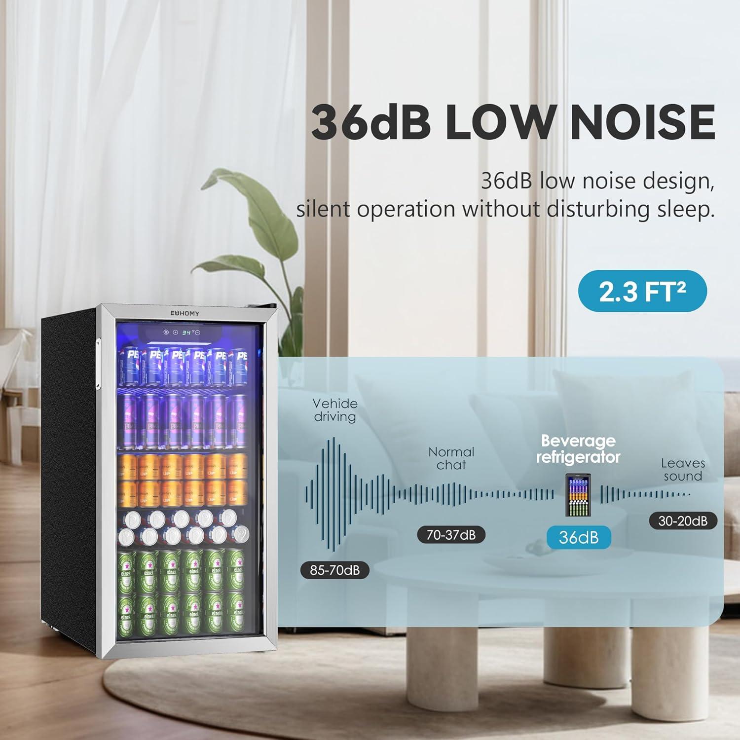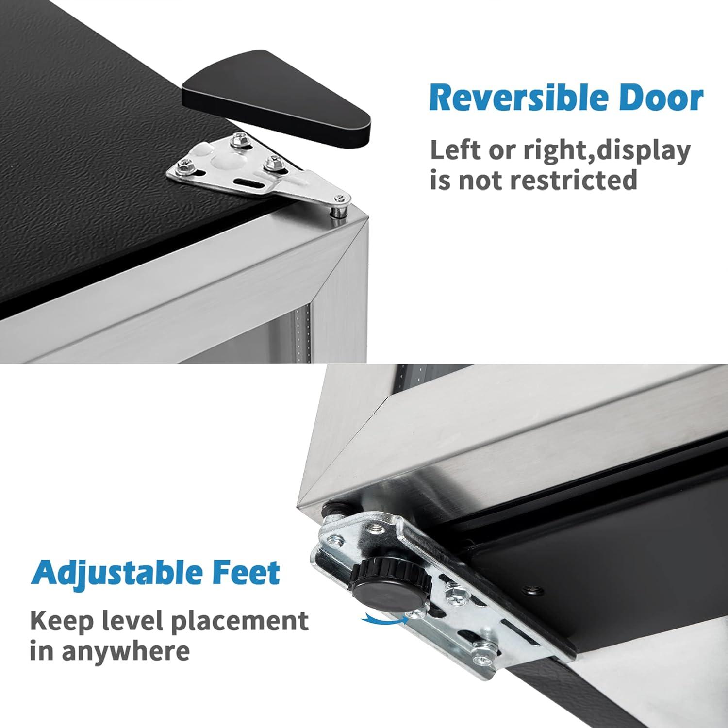 Crafted Design-The beverage cooler is equipped with a removable chrome-plated partition to separate the interior space, and the hinged transparent glass door is not only beautiful, but also can be opened in the left and right direction by yourself. The mini fridge for office will run at 40dB or less, so you can sleep well