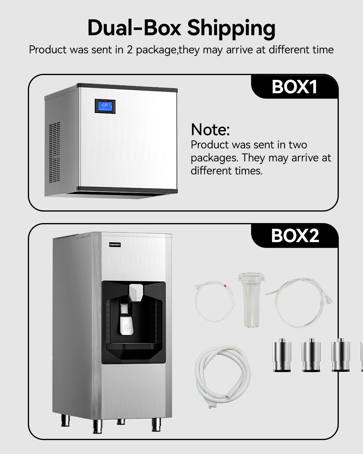 Dual-box shipping Please note that the two boxes may arrive at different times during transportation. If you have any question while using the commercial ice maker, please let us konw promptly, We're always here for you whenever you need assistance