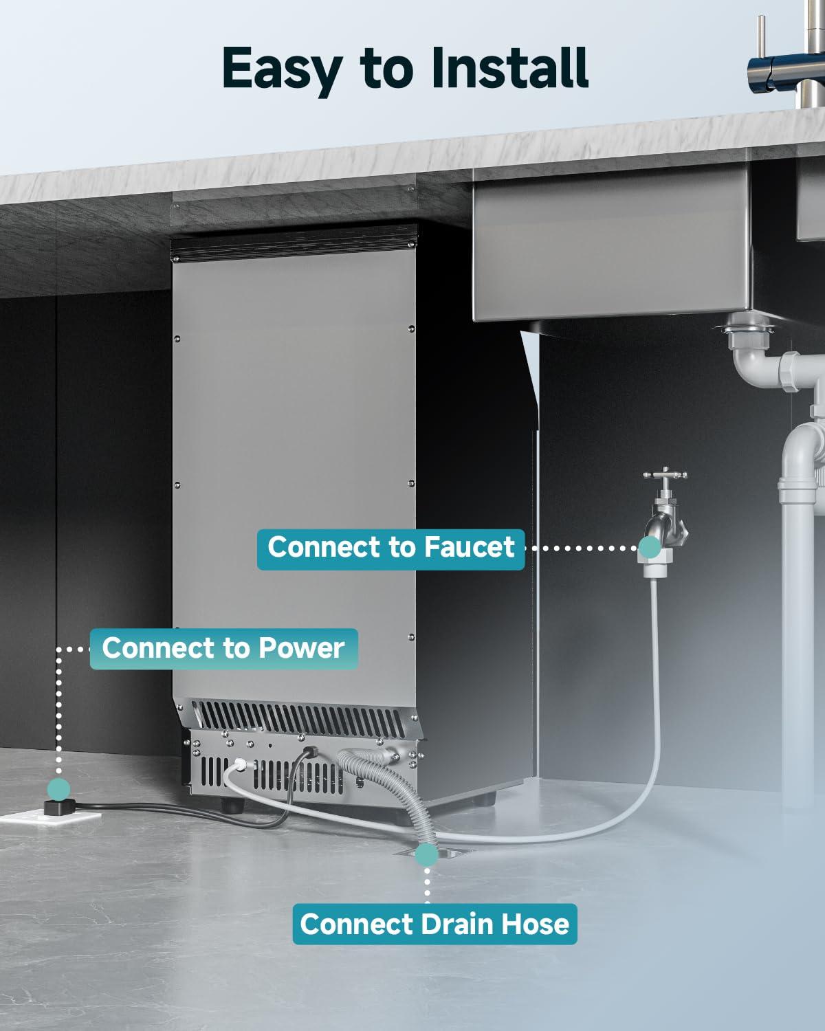 Durable, Reliable & Safe: Built with a pure copper compressor and a stainless steel body, this commercial ice maker is engineered for long-lasting performance. It is ETL certified for commercial use, ensuring both safety and reliability for professional or home settings. To guarantee crystal-clear, safe ice every time, the machine also comes with an upgraded water filter that effectively removes impurities, pollutants, and heavy metals.