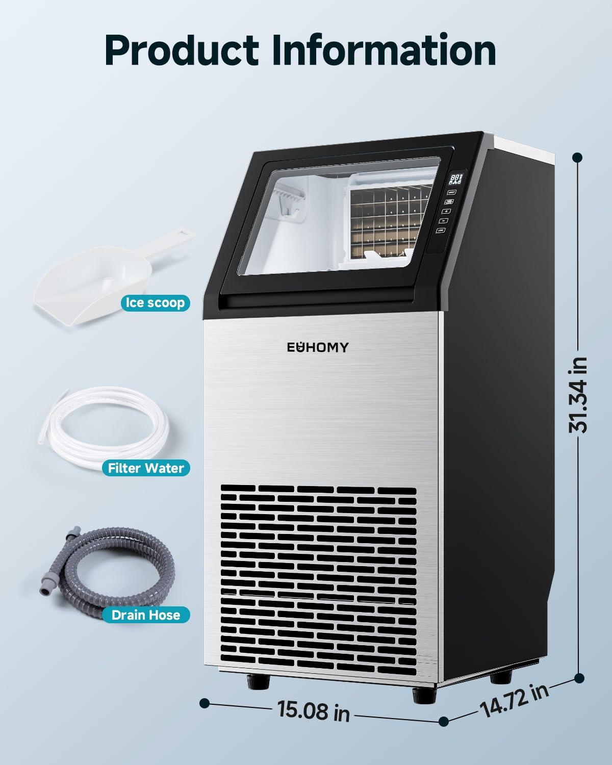 EUHOMY Commercial Ice Maker Machine,100lbs/24H Stainless Steel Under Counter Ice Machine with 33lbs Storage Bin, Freestanding Ice Maker for Home/Bar/Cafe/Restaurant(100lbs/day)