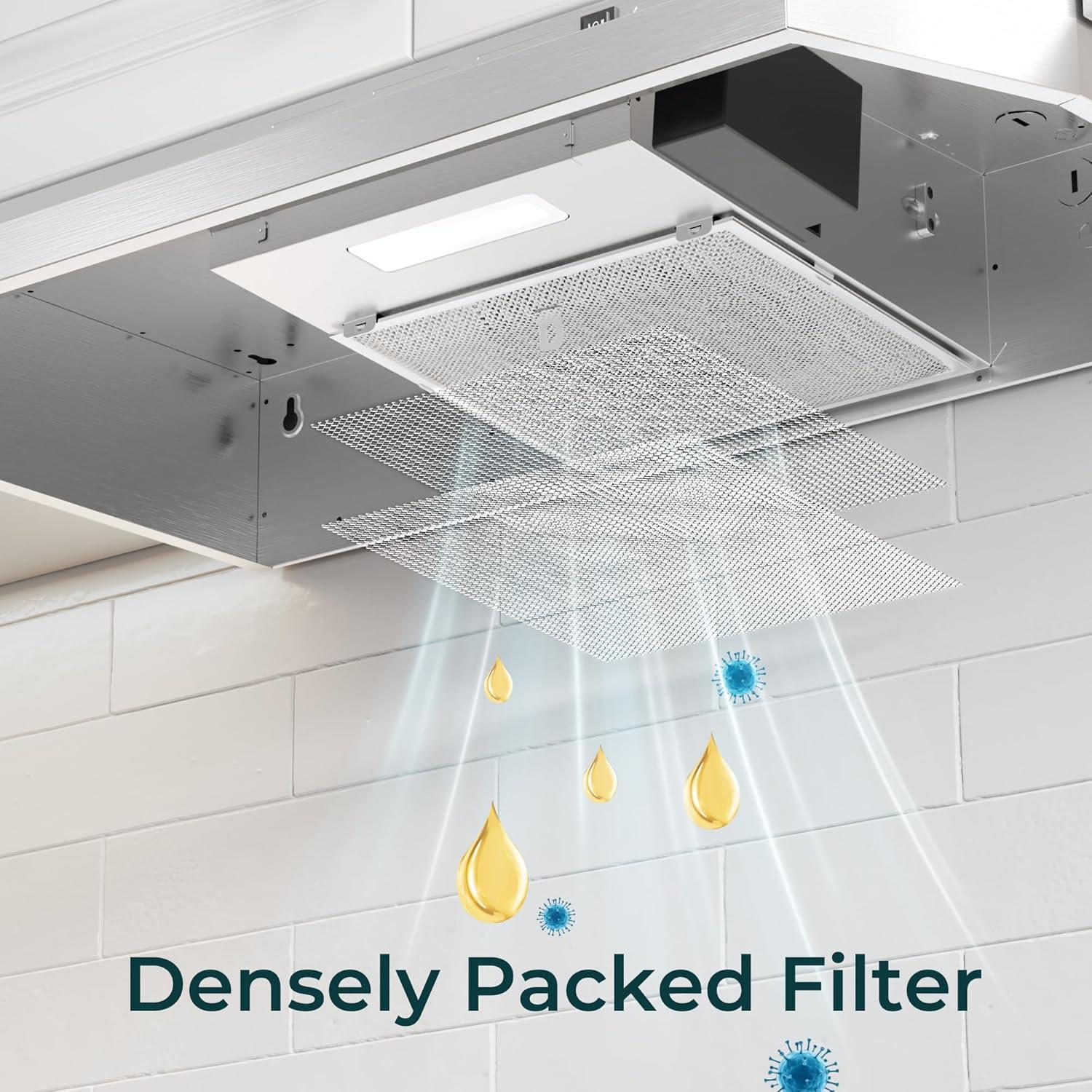 【High-Efficiency Filter & Easy Breath】Euhomy ductless range hoods boast a high-density grease filter, expertly designed to purify cooking fumes and ensure a cleaner kitchen environment. This efficient filter is not only easy to clean but also straightforward to maintain, simplifying the upkeep of your vent hood. Also, to preserve optimal grease capture performance, regular cleaning of the filter is crucial. The user-friendly design ensures that maintaining a fresh and smoke-free kitchen remains hassle-free