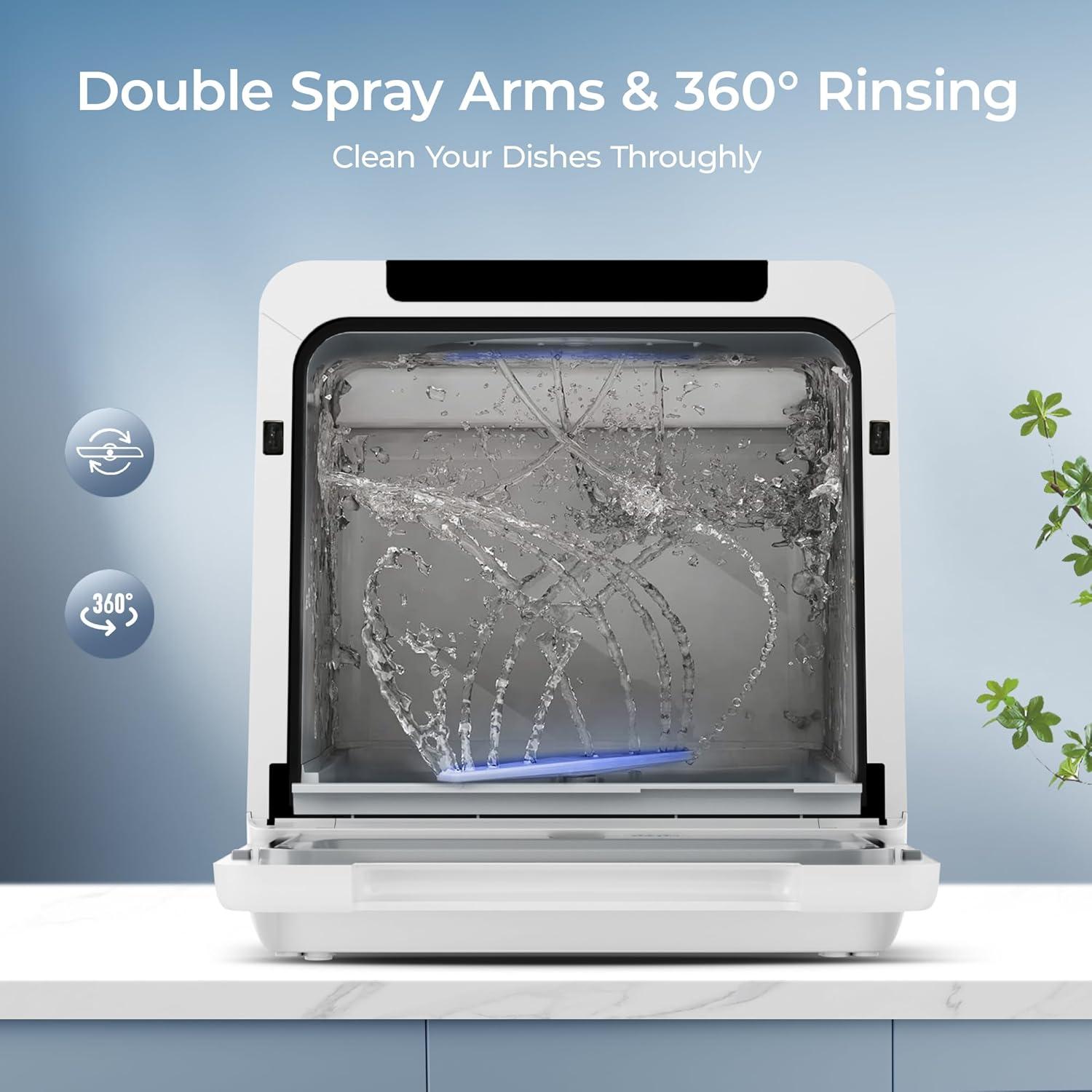 𝟖 𝐖𝐚𝐬𝐡𝐢𝐧𝐠 𝐏𝐫𝐨𝐠𝐫𝐚𝐦𝐬 𝐟𝐨𝐫 𝐅𝐚𝐦𝐢𝐥𝐲 𝐌𝐞𝐦𝐛𝐞𝐫𝐬: Euhomy compact dishwasher offers 8 programs: Normal, ECO, QUICK, Baby Care/Strong, Glass and Fruit, Self-clean, and Dry Mode. In Normal mode, the dishwasher uses a Hot-Cold-Cold-Hot water cycle to ensure thorough cleaning. The Quick offers a 29 minutes fast wash. While the Baby Care/ Strong mode of our mini dishwasher operates at a scorching 167°F, ensuring baby products and greasy dishes are thoroughly cleaned. Also, our small dishwasher's dual spray arm system delivers 360° profound cleaning, ensuring accessories can be thoroughly washed even pet bowls, collars, leashes, and more